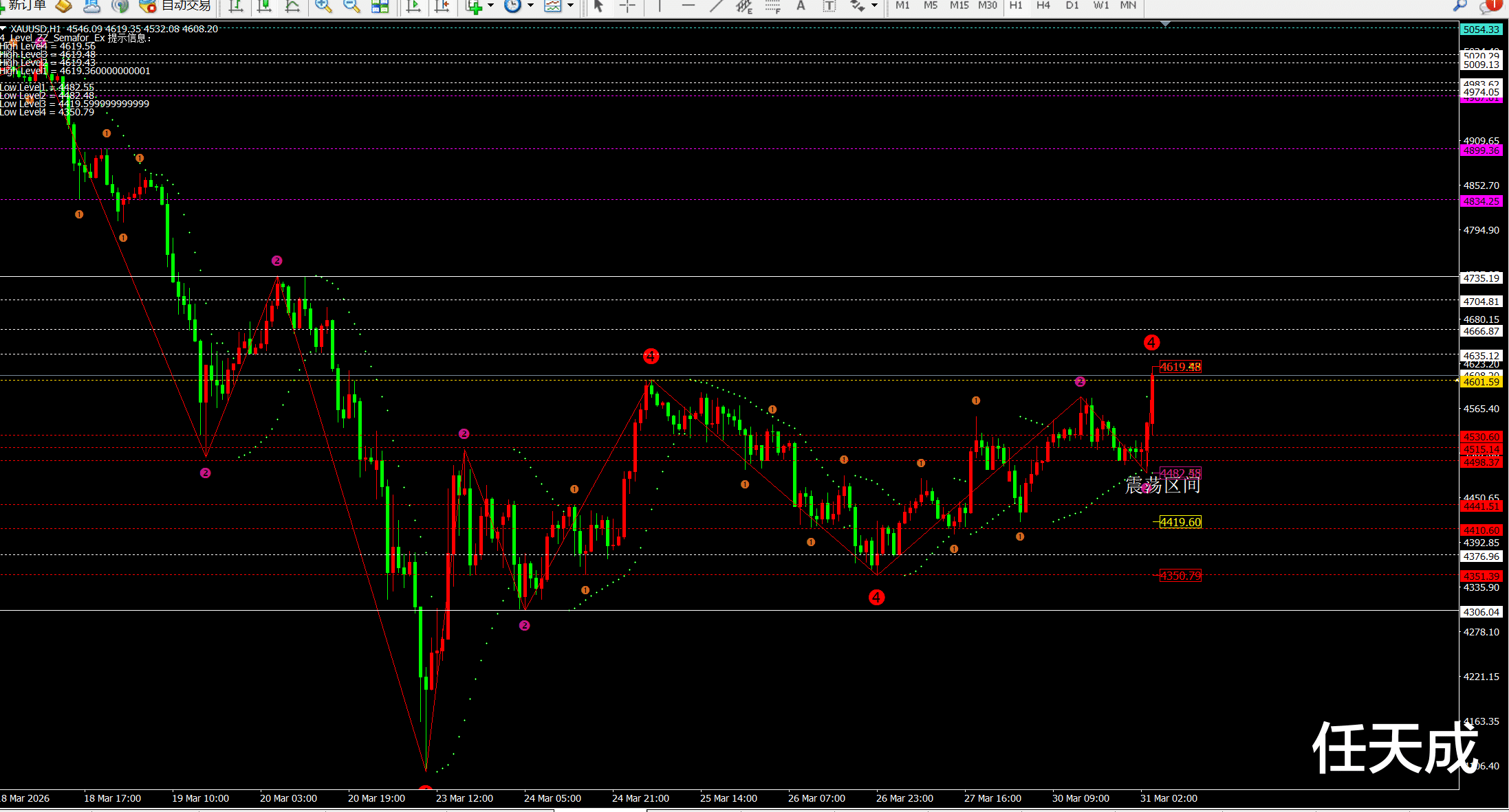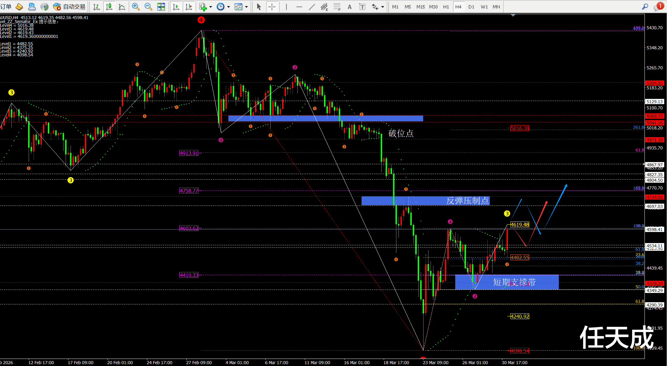 从4小时图看目前价格在试探4602一线的高点压制;突破将试探4700-4730-4758一线。