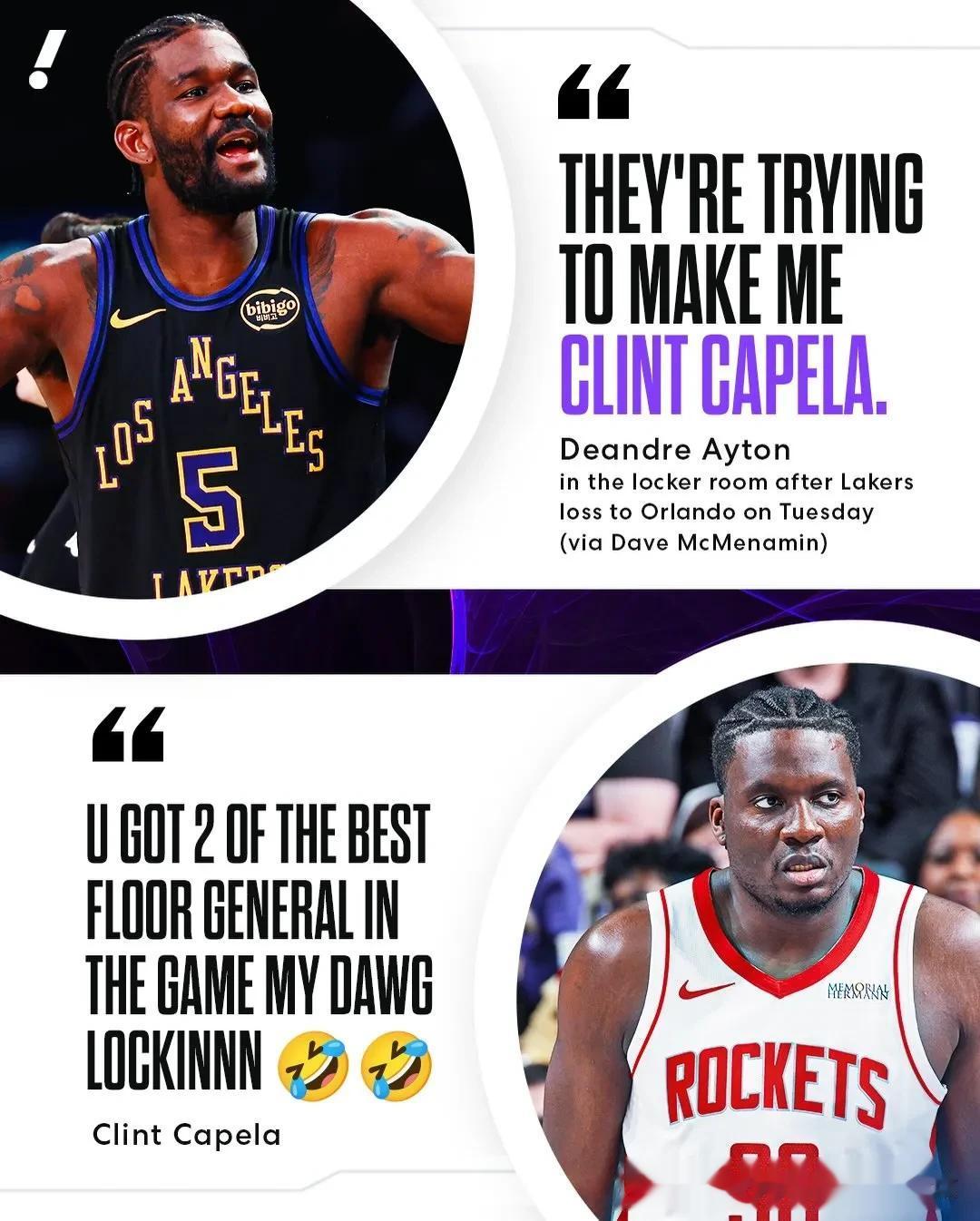 湖人中锋艾顿似乎很看不上卡佩拉,最近表示不希望外界将他跟卡佩拉相提并论,这激怒了卡佩拉。