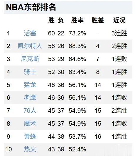 东部前10分别是活塞、凯尔特人、尼克斯、骑士、猛龙、老鹰、76人、魔术、黄蜂和热火。