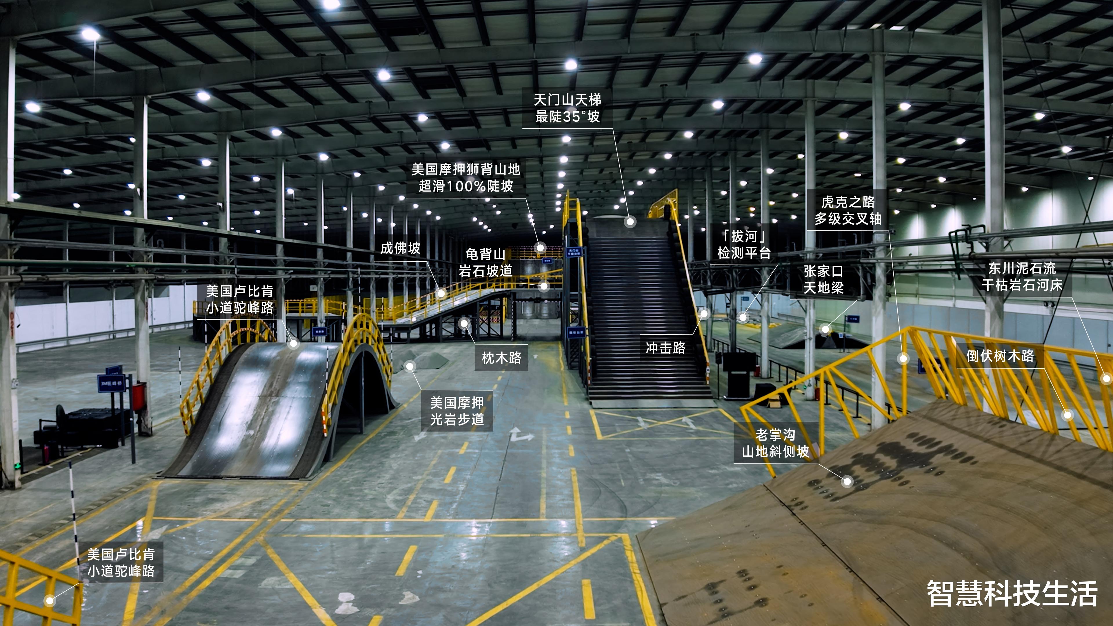 12000平方米的室内场地,天门山天梯、可变附着力坡道、轮定力学测试平台……三十多套专用工装,把全球经典越野场景硬生生"复刻"进了钢结构厂房里。这不是为了拍照好看,背后有一套很务实的逻辑。