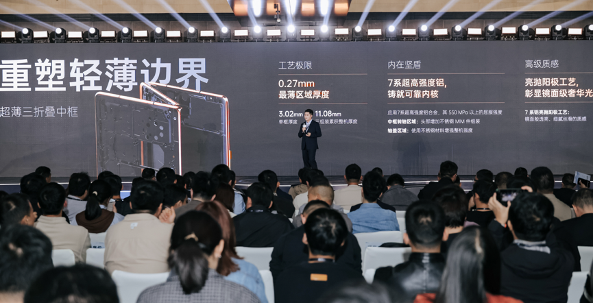 制造层面,瑞声展出了超薄三折叠中框和 AutoFlip 自动铰链。后者支持一键自动开合、角度悬停和智能记忆拍照,明显是针对小折叠设备的人机体验痛点而生。