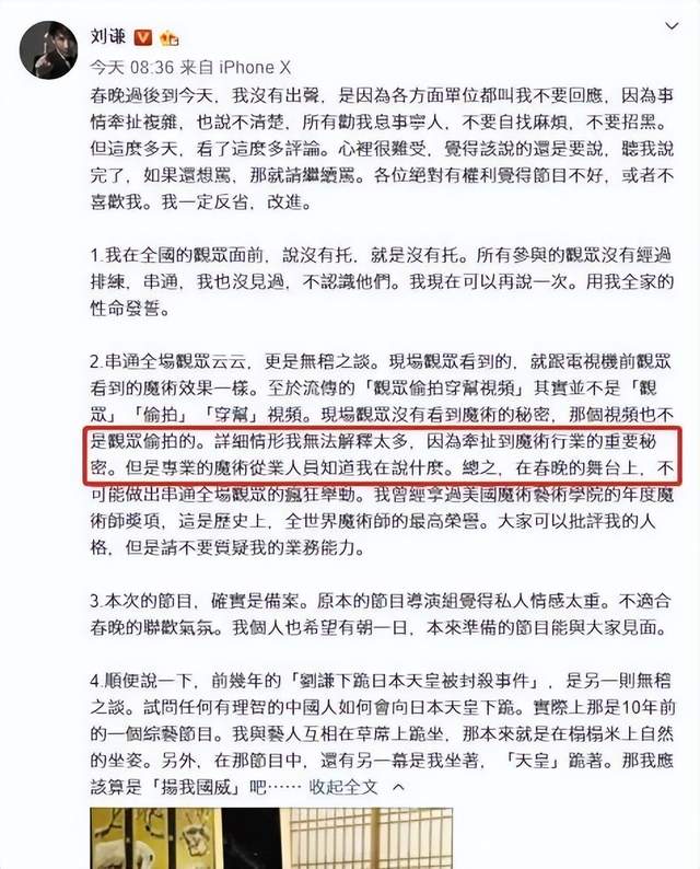 观众们不能接受。开始铺天盖地的讨伐刘谦。沉寂多天之后,刘谦也终于发声。