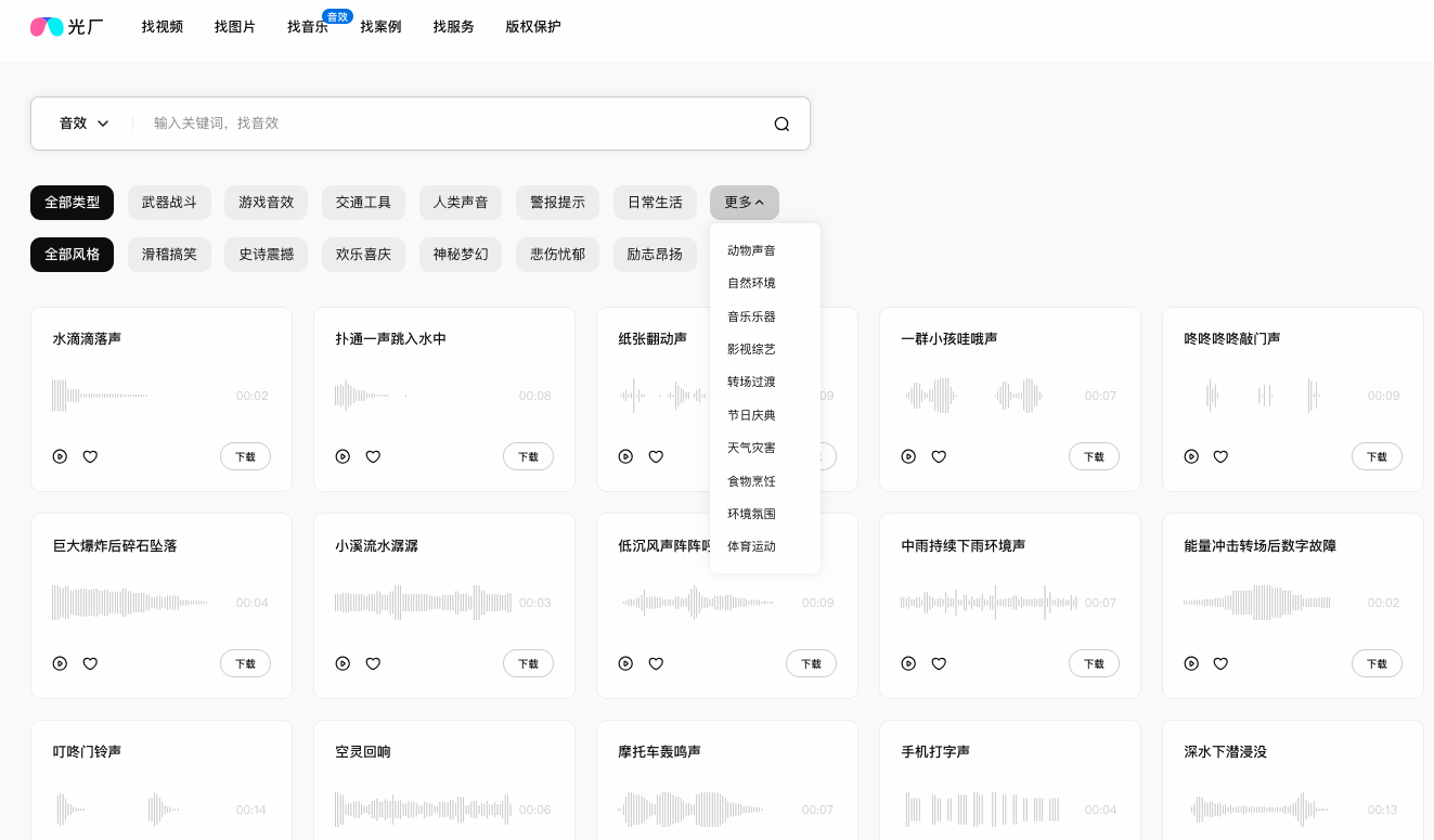 光厂音效的核心优势,首先体现在其海量且多样化的素材库上。平台收录了覆盖全场景的超高品质音效。无论你的创作指向何方,这里几乎都能找到匹配的声波: