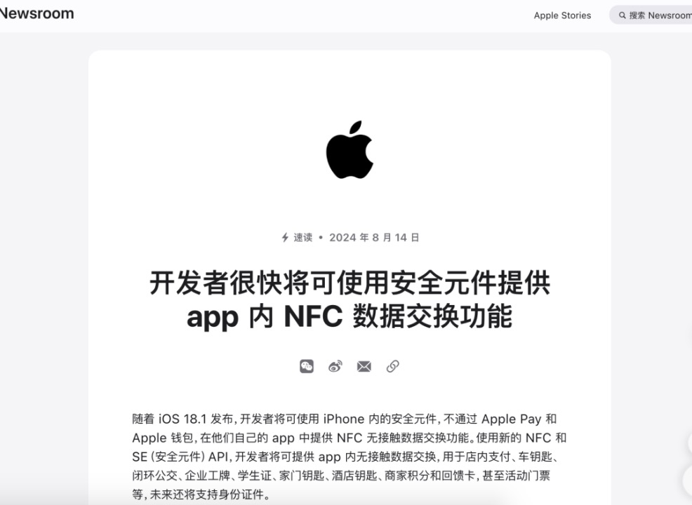 最近苹果宣布在iOS 18.1中开放NFC功能。这本该是移动支付的福音,因为开发者可以绕过Apple Pay,直接在自己的应用中使用NFC进行非接触式支付。然而,从苹果公布的国家和地区名单来看,澳大利亚、英国、日本、巴西都有份,偏偏中国市场不在其中。