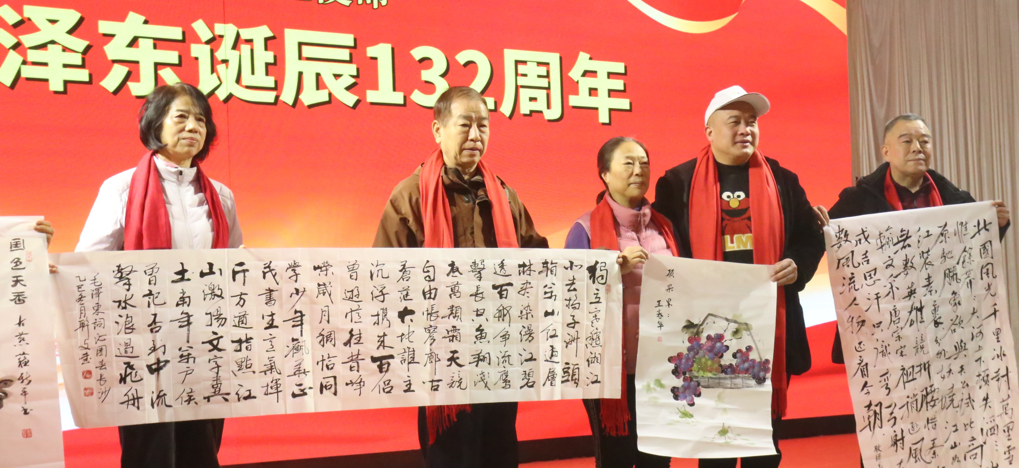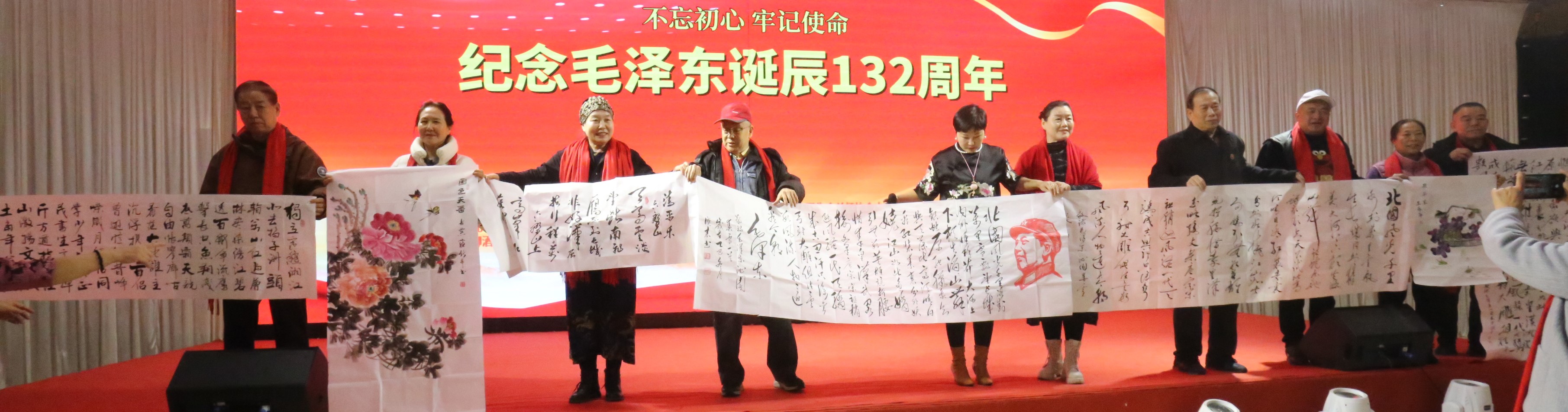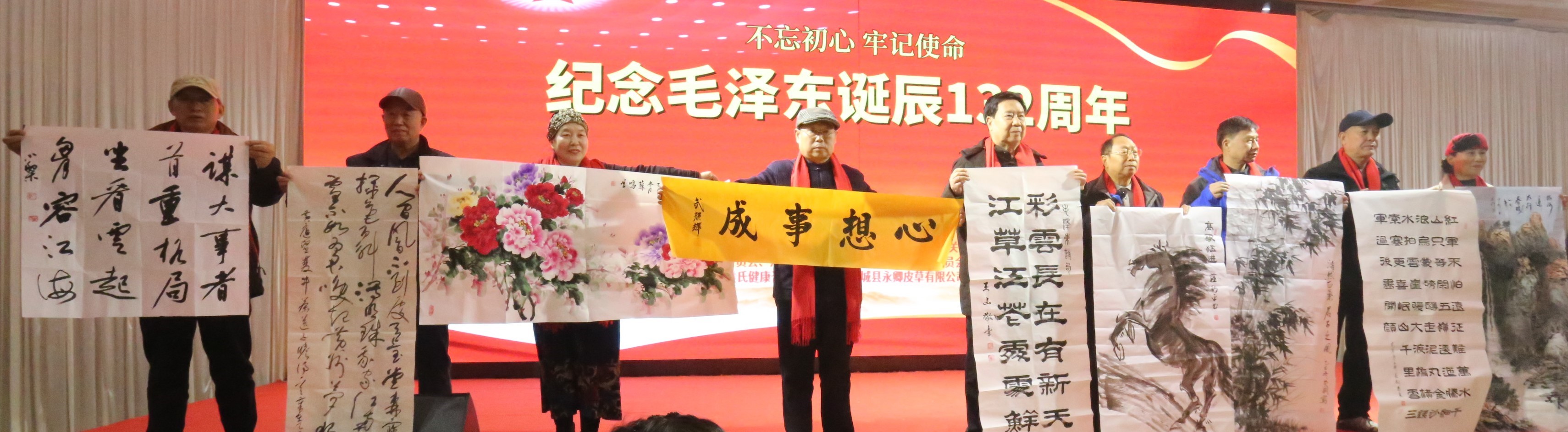 思想的共鸣,亦寄于丹青翰墨之中。在精彩的演出之后,活动迎来一个温馨的环节——艺术家敬赠墨宝。李文雁、孙常军、杨联文、郧荣会、张继胜、李素云、车飞、武颜辉、霍东来、杜玉山、李建新、集慧燕等书画名家满怀对伟人的崇敬与对时代的热情,以笔抒怀,以墨传志。“数风流人物还看今朝”“江山如此多娇”“为人民服务”等毛泽东同志的名句与经典论断,在笔墨的流转间被再度铭铸,焕发出新的时代光彩。这不仅是艺术的呈现,更是精神的馈赠;不仅是对历史的致敬,更是对信念的书写。墨香萦绕之中,红色初心化为可感可触的文化符号,深深烙印在与会者心中,将思想的力量化为接续奋斗的视觉见证与永恒信物。