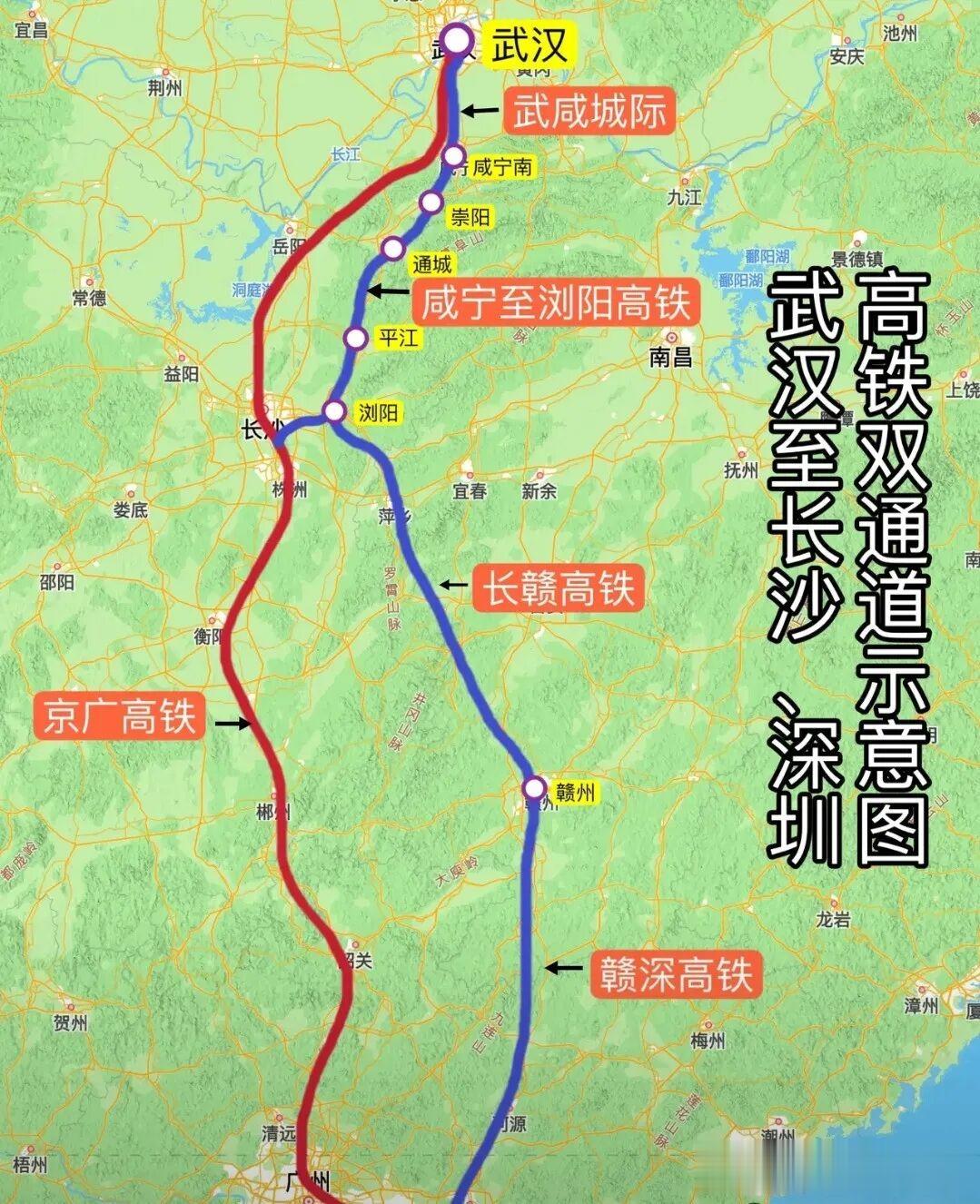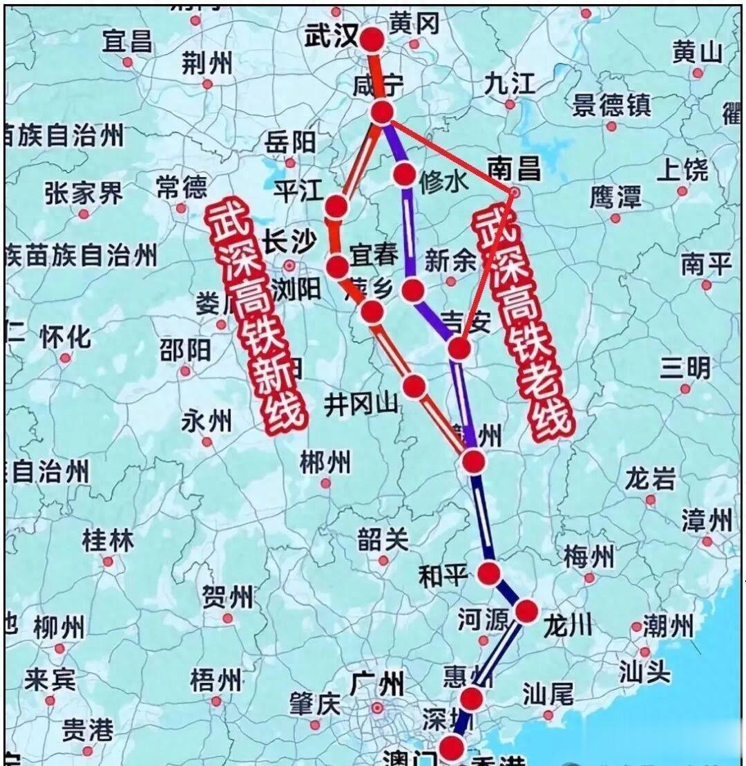 首先,在路线效率上,湖南线“更直更快”。高铁的首要目标是快速连接核心城市群。武深高铁作为国家干线,应优先追求点对点运输的最高效率。湖南方案路径顺直,而江西方案为了接入宜春,线路会出现一个明显的“弯绕”,无形中增加了里程和时间成本,对于往返于武汉与深圳之间的主流客流而言,这并非最优选择。