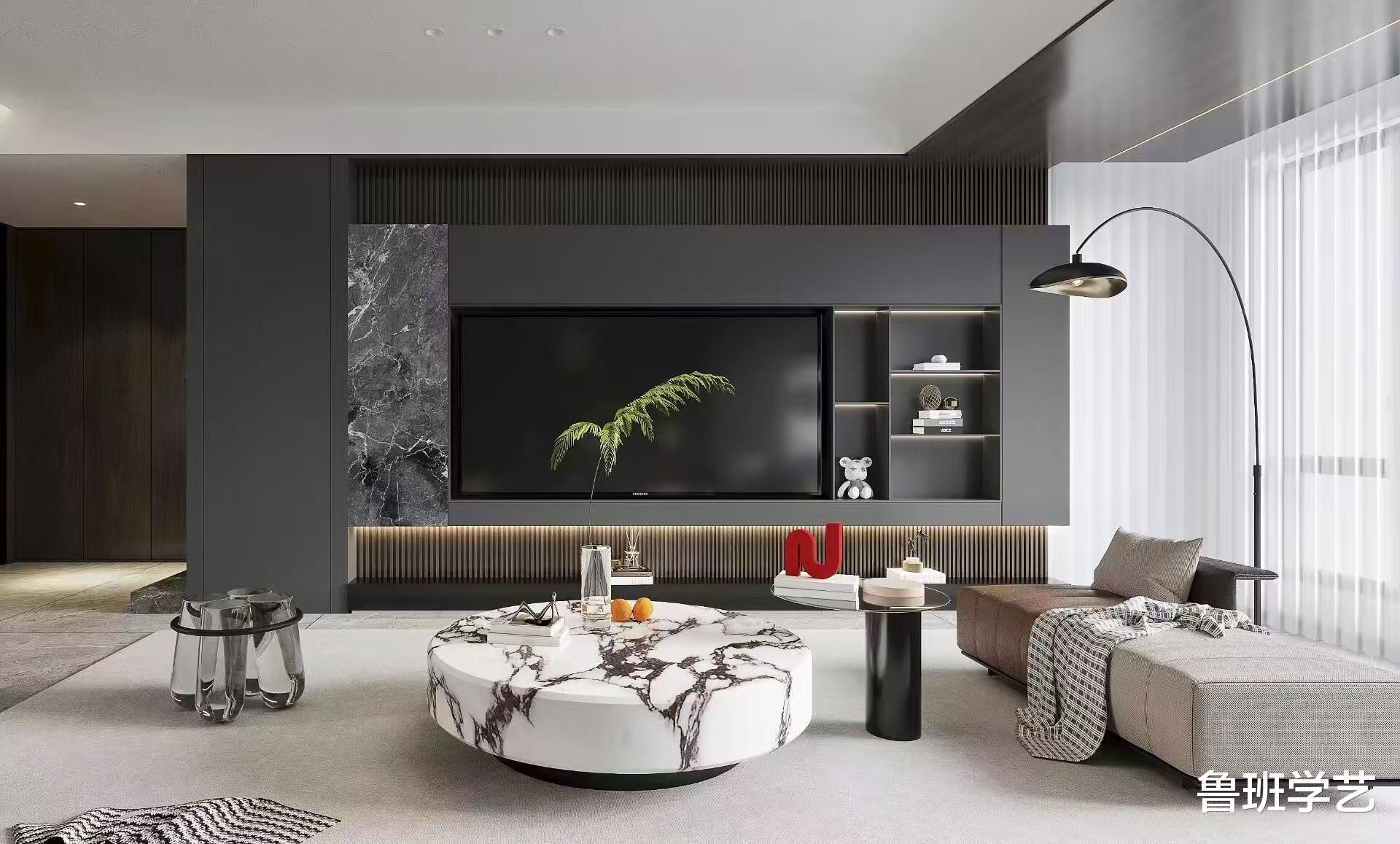 主体家具:米色床褥,缓冲颜色的冲击感。旁边搭配黑色的床头柜,既呼应了男主人的沉稳,也增加了空间的质感。让“复古棕绿”成为家的灵魂客厅电视墙采用黑色搭配,更显气质。
