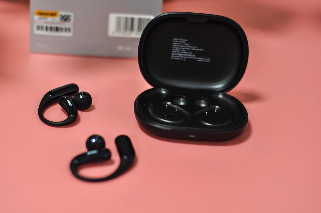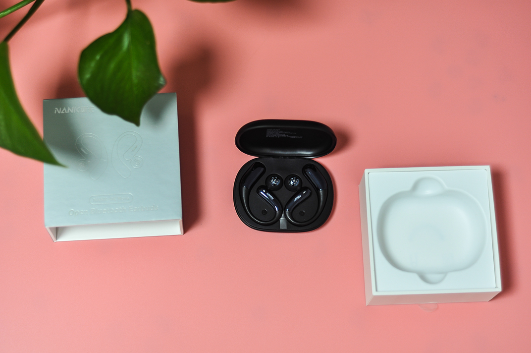包装设计上,南卡 OE Nova 延续了品牌简约务实的风格。采用抽拉式礼盒包装,正面印有耳机悬浮式耳挂的立体效果图,搭配银色的英文标识,辨识度十足。背面标注了产品型号与厂商信息,侧面用英文图标点缀。打开包装,耳机与充电仓嵌在卡槽中。盒内附赠了 Type-C 快充线、说明书及合格证,配件齐全且细节贴心。