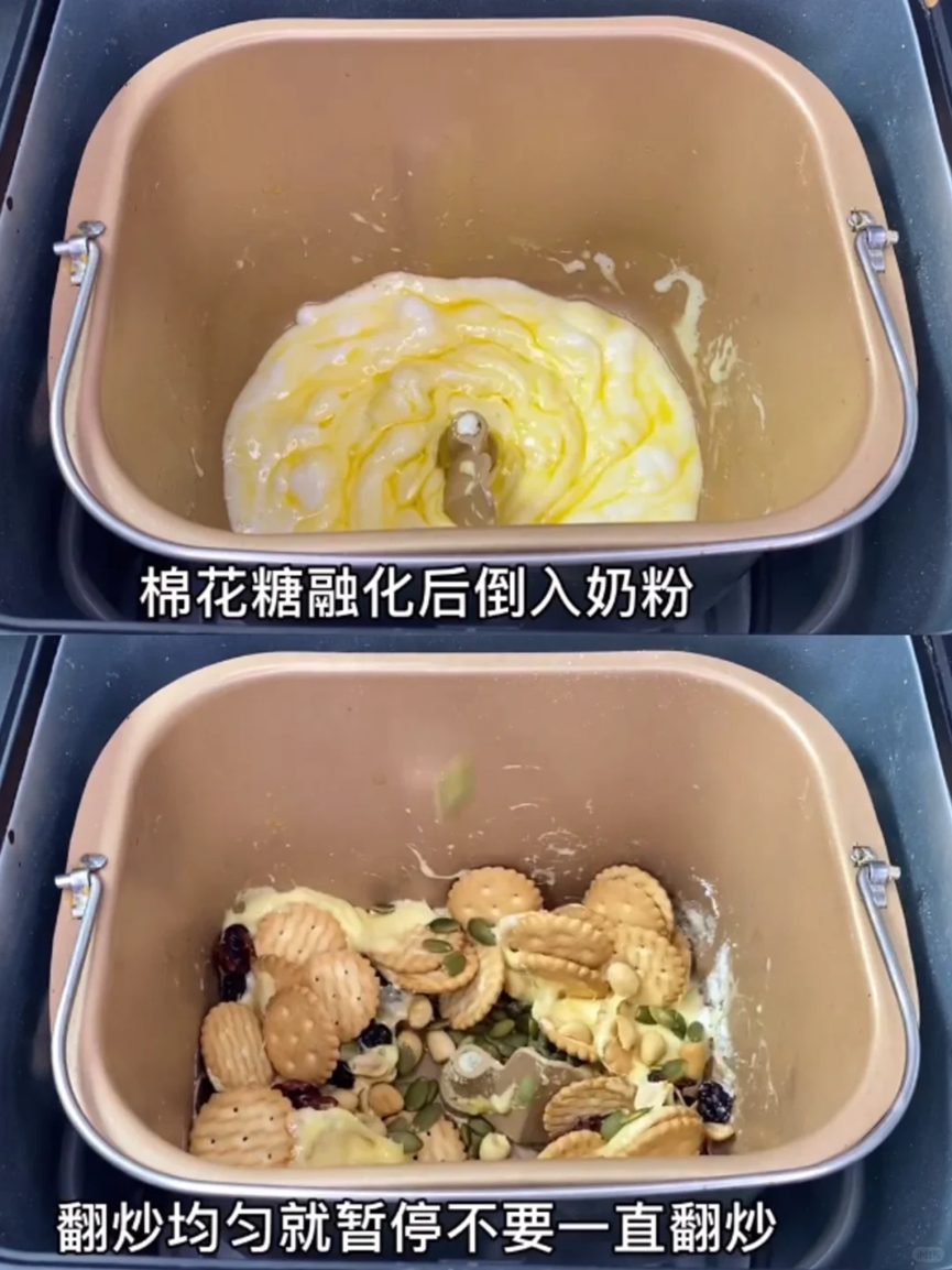 等饼干以及坚果等食材裹满棉花糖之后就可以暂停了,不需要一直翻炒。