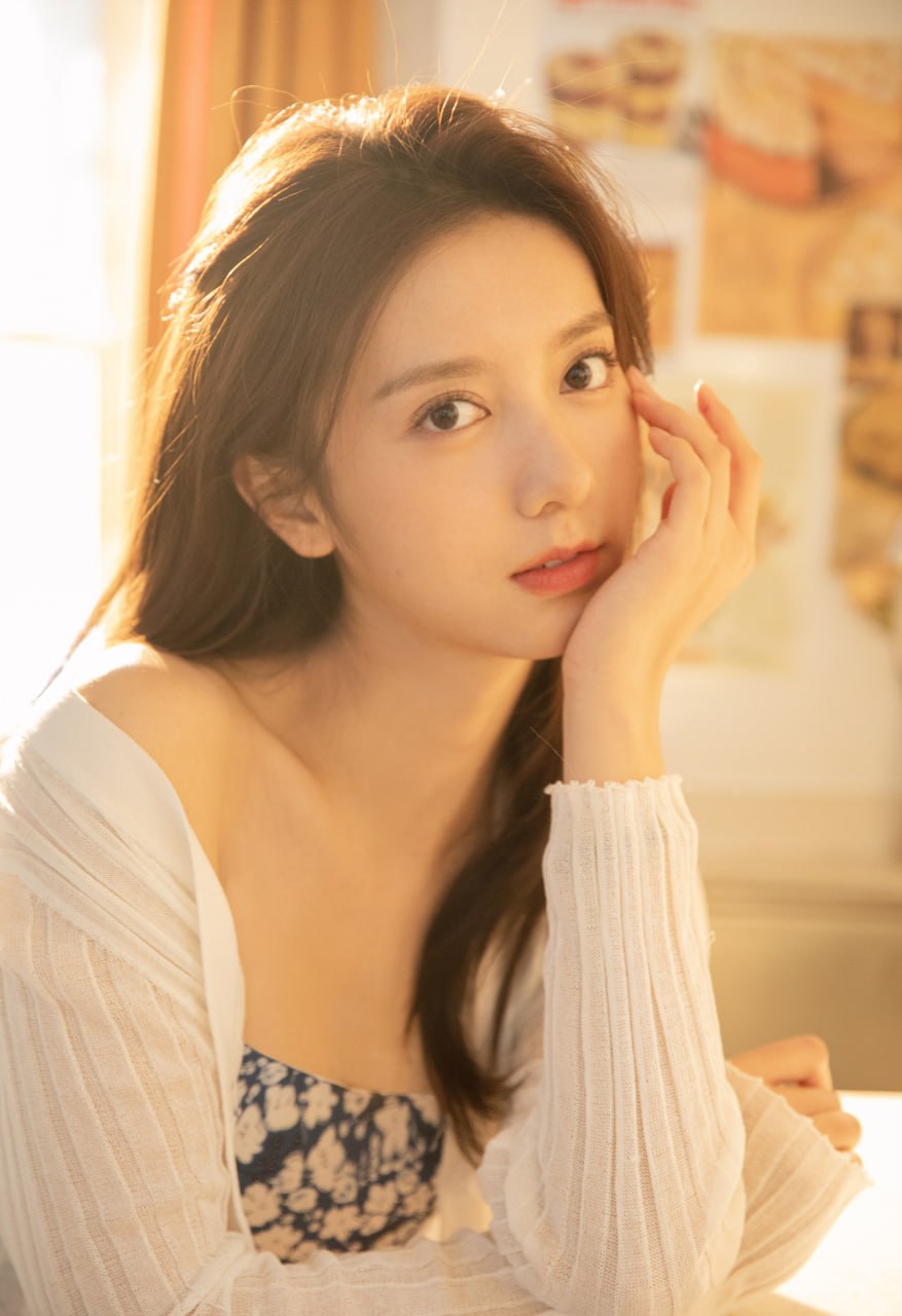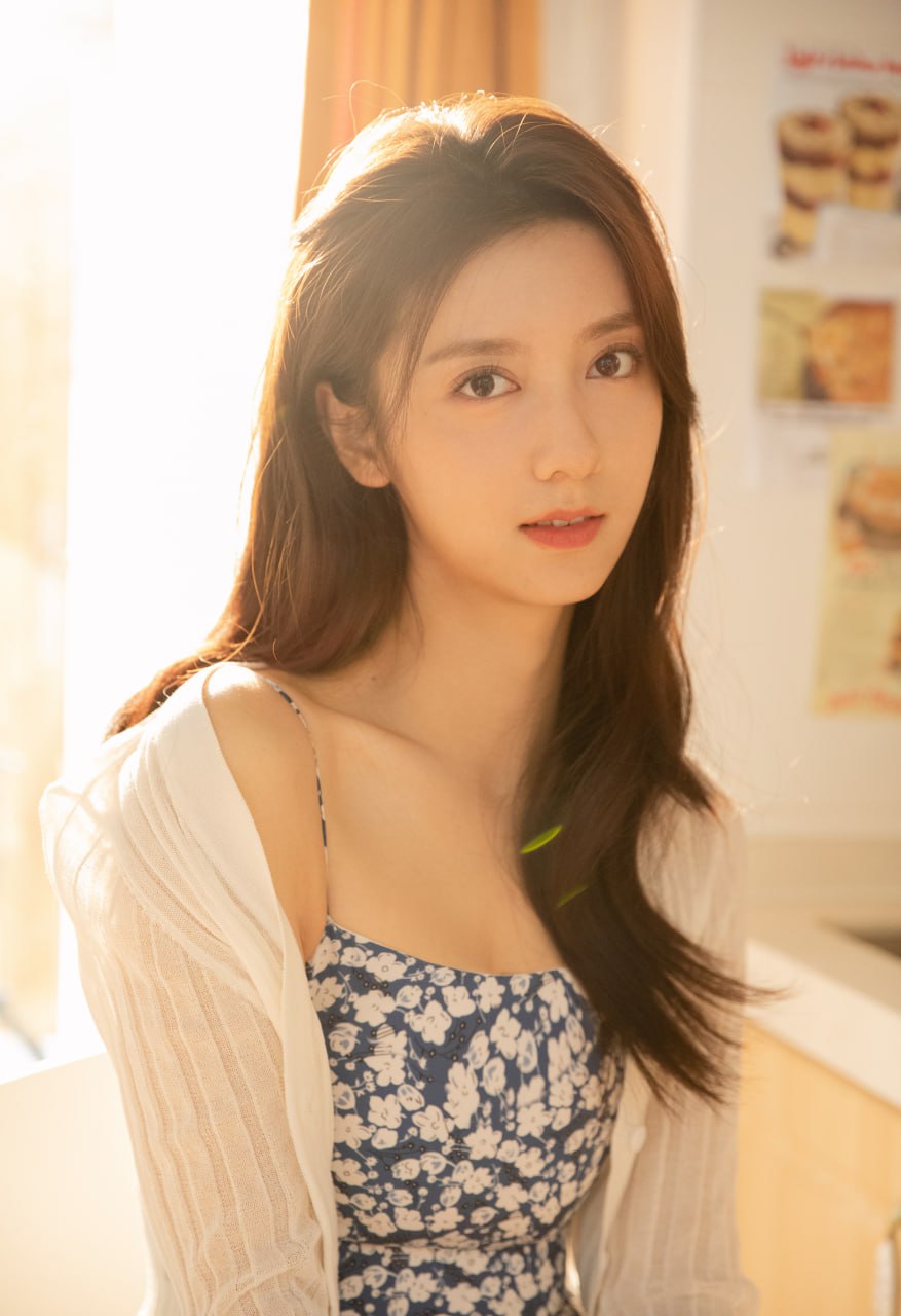 在柔和的晨光里,她的五官显得格外柔美:眼神明亮干净,带着一点浅浅的笑意,让整个人看起来非常亲切、舒心。她的长发自然垂落,衬得气质更加温柔。