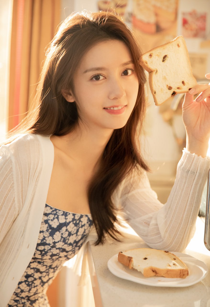 穿着碎花吊带裙和薄薄的白色开衫,清爽又很有少女感。手里轻轻举着一片面包,加上身旁的早餐场景,让整个画面都充满了治愈般的日常氛围——像是早晨醒来第一眼看到的温暖画面,简单却很美好。
