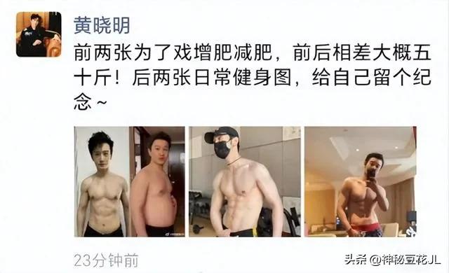 4 月 10 号那天呀,黄晓明这家伙居然在朋友圈亮出了自己的肌肉照,还配上了文字:“头两张那可是为了戏拼命增肥又减肥,这体重前后差了大概五十斤哟!后面两张是平常健身的图,就给自己留个念想呗~”