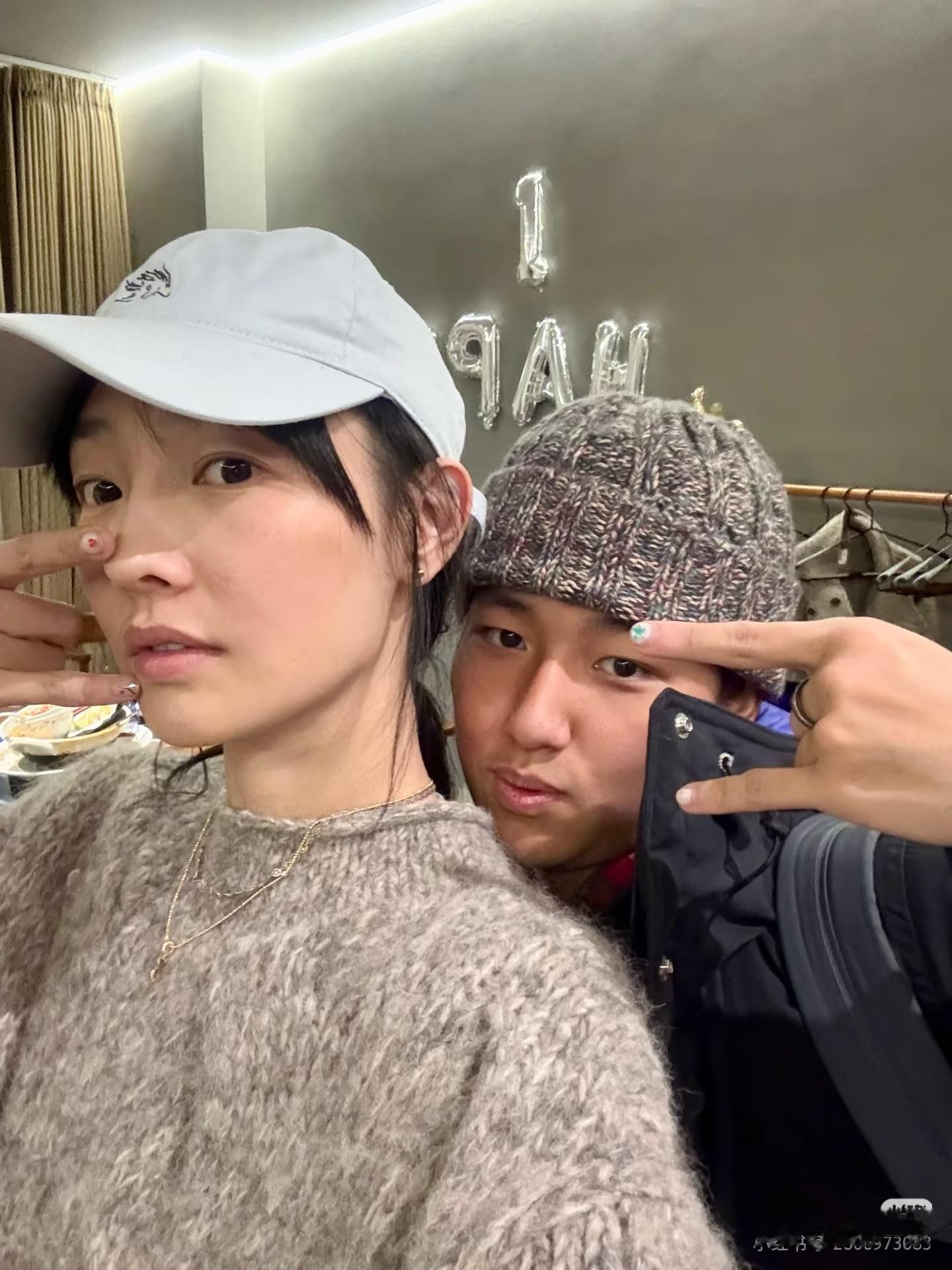 旁边的元宝戴着针织冷帽,穿着黑色棉服,笑得眼睛都眯成了缝,露出一口白牙,那股子阳刚开朗的劲儿,一点看不出是单亲家庭的孩子。母子俩对着镜头同步比手势,一唱一和的互动,说是亲姐弟都有人信。