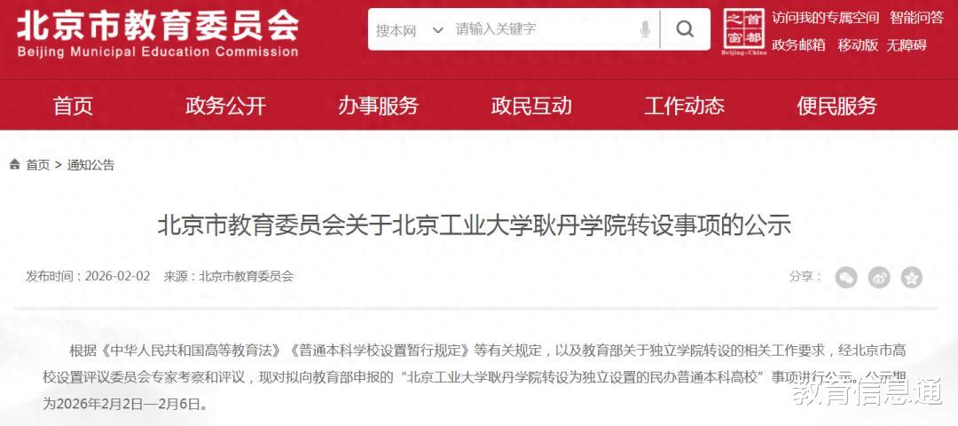 2月2日,北京市教委官网发布《北京市教育委员会关于北京工业大学耿丹学院转设事项的公示》,拟向教育部申报的“北京工业大学耿丹学院转设为独立设置的民办普通本科高校”。