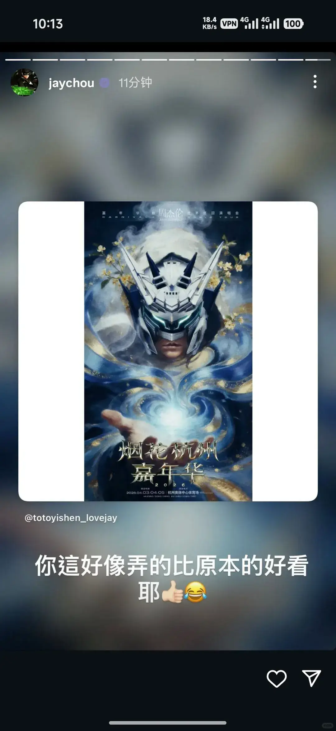 不过吐槽归吐槽,歌迷们的创造力直接救场!有位叫@toto 依深 的网友,做了一张二创海报,保留了机甲的神秘感,又加入了蓝金水墨质感,把《烟花易冷》的温柔、江南水韵的诗意和年轮意境巧妙融合,高级感直接拉满,没想到周杰伦本人刷到后,居然在IG上点赞,还留言:“你做的比原本的好看耶”,相当于本尊亲自下场吐槽官方海报,这波官方真的太尴尬了,连天王本人都看不过去了。