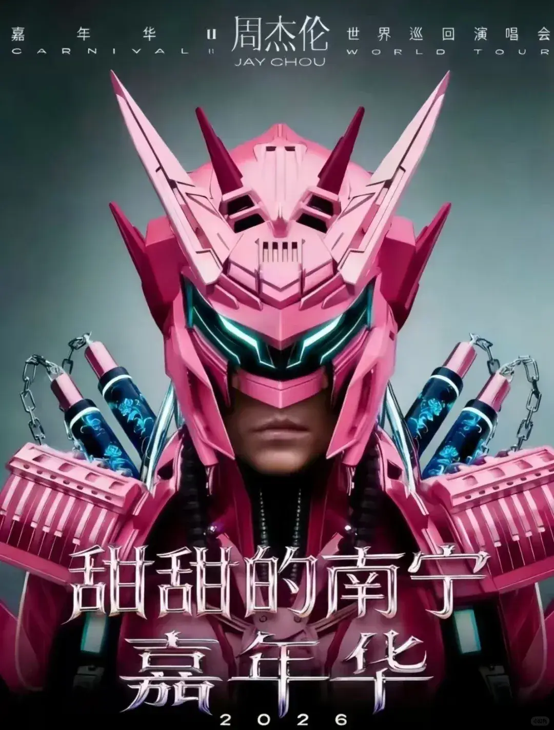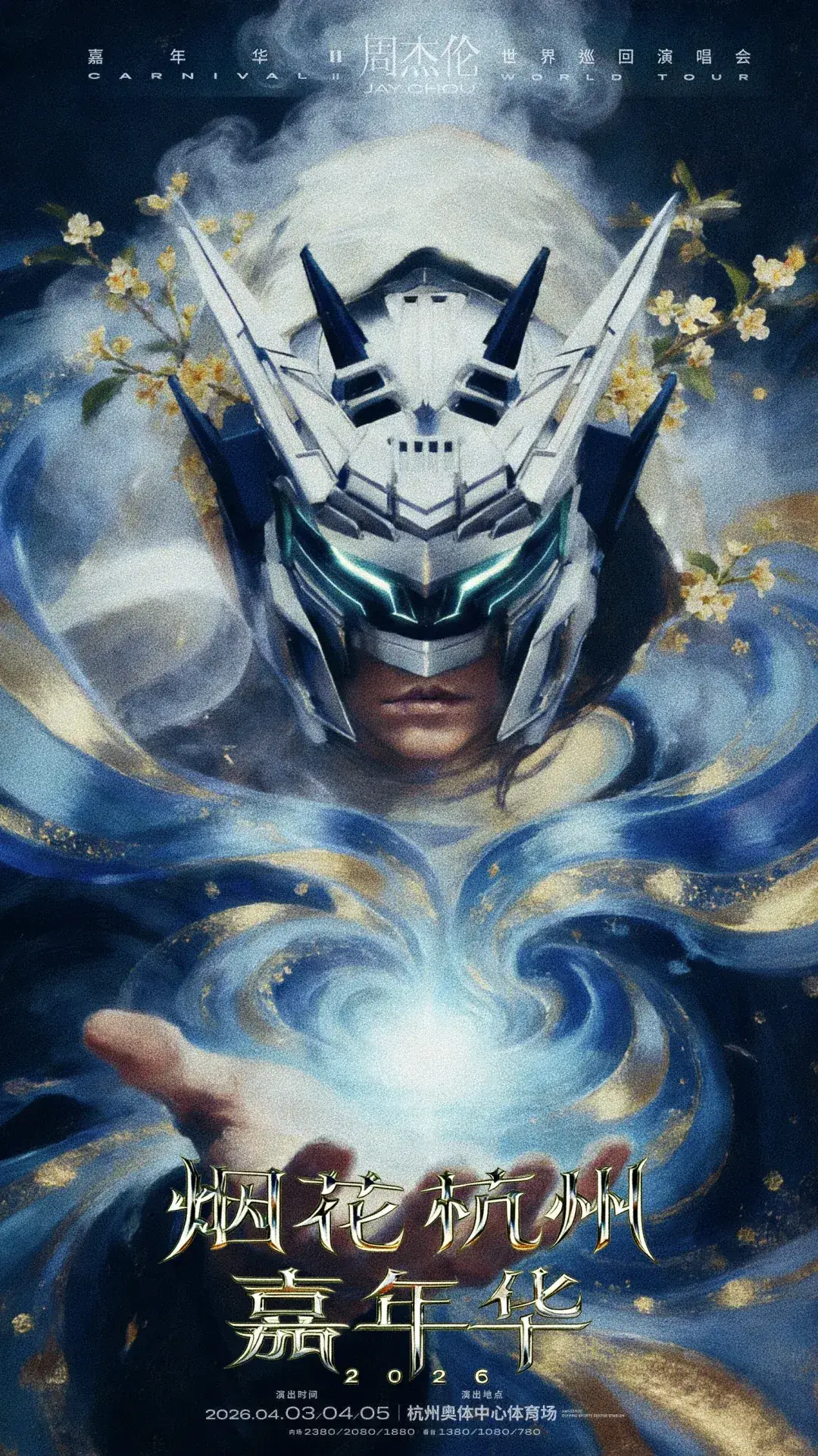 咱先说说这张争议拉满的海报,具体长啥样——海报里的周杰伦,一身银灰机甲铠甲,头戴荧光绿头盔,背着标志性的双截棍,硬生生把唱江南小调的天王,打造成了“高达战士”,主办方本来想走“国风×赛博”的混搭路线,把机甲的科技感和青花瓷、烟花的国风元素结合,可没把控好尺度,硬生生变成了“高达误入古风片场”,违和感直接拉满。