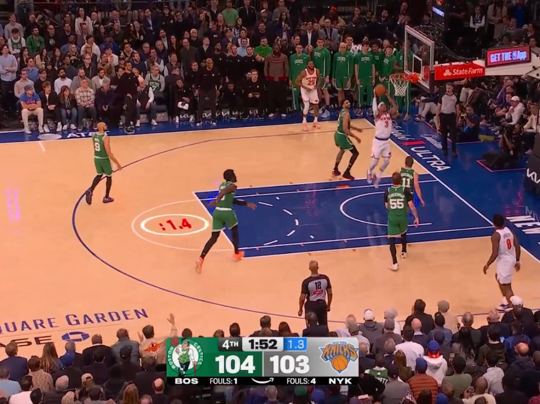 ——剩下2分钟前,尼克斯103-104落后1分,哈特接布伦森传球空切上篮反超;