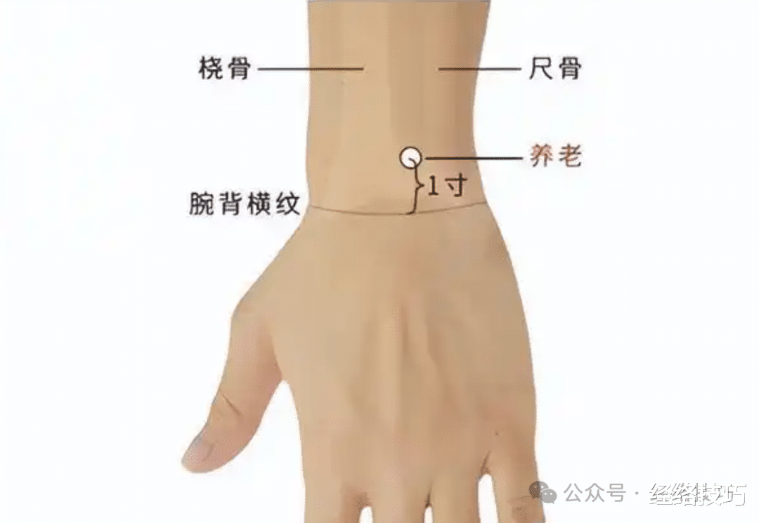 手心对着自己,小臂稍微弯一下,小指那侧手腕外侧能摸到一个凸起来的骨头尖,顺着那个尖往手臂方向大概一个指头宽的缝里按下去,有酸酸胀胀的感觉,那就是养老穴。