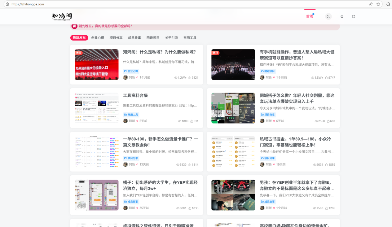 10、知鸿阁这上面起码有100多个互联网方面的项目,比如某鱼、某红书卖虚拟资料、公众号写作变现、网盘拉新......各种小项目。