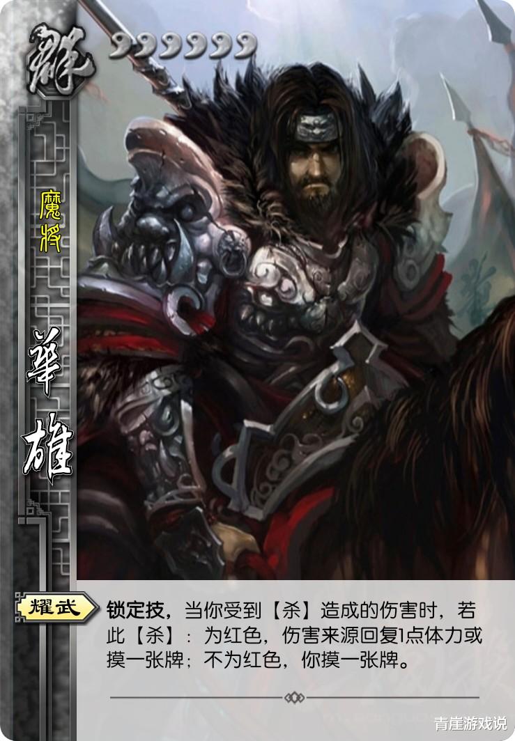 界华雄【耀武】增加受到黑色杀的伤害后会摸1张牌的效果。这有何用!负面的技能效果仍然存在……其实作为一个血厚的肉盾,华雄只要取消掉【耀武】的负面效果、甚至是只增加正面效果,也不至于太弱。面对界华雄,依旧只要使用红杀,他没有丝毫招架之力!