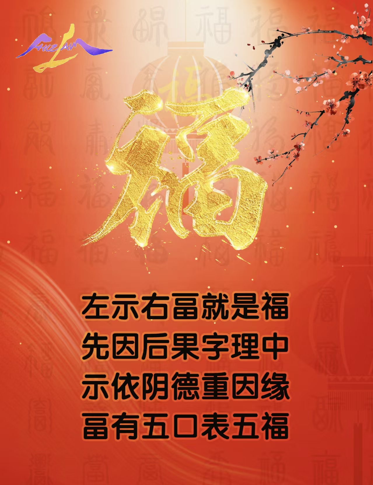 【福】左示右畐就是福,先因后果字理中示依阴德重因缘,畐有五口表五福“左示右畐就是福,先因后果字理中”,福字左边偏旁叫示字