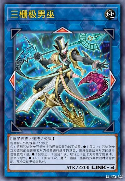 除开这些幻崩本家以外打幻崩拳其实还有两位场外大哥,一张是电子界的防火龙在自己的回合用以回收墓地资源进行进一步展开,在对手回合则是弹卡回收进行干扰,另一张则是三极男巫,这张卡做为link3怪兽其效果在每一个箭头都有互相链接怪兽时逐步检索,在有3只相互链接时则拥有一回合一次的三色康。
