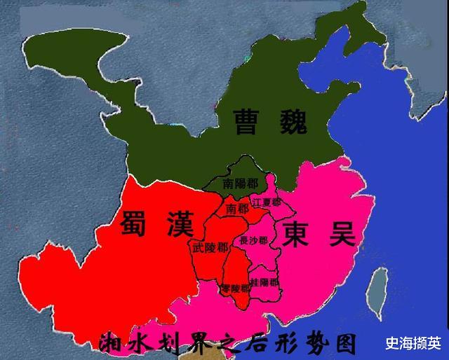 赤壁之战后,荆州由魏蜀吴三家瓜分,曹操虽败,却仍保有北部的南阳郡;孙权占据了南郡和江夏郡长江以南部分;刘备则趁曹操与孙权交战之际,以刘琦的名义招降了荆州的江南四郡,即长沙郡、武陵郡、零陵郡和桂阳郡。