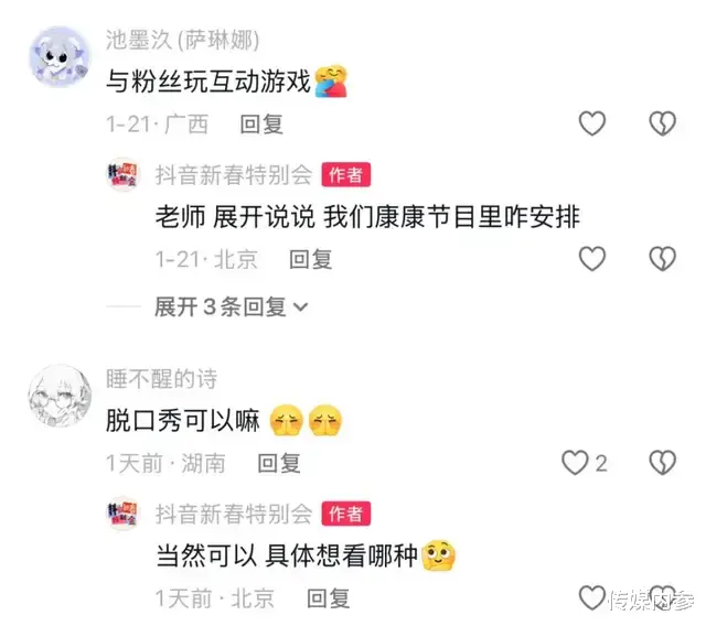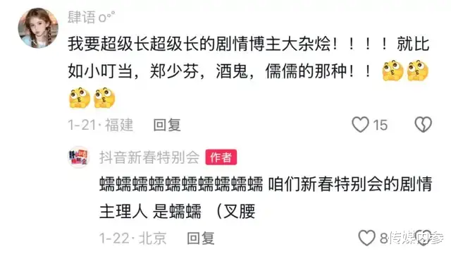 全民共创,本质上是一场平台、用户与创作者之间的三方奔赴,它让内容与需求能够精准相遇,形成“用户需求驱动内容生长,内容生长反哺用户期待”的生命力闭环。在晚会策划期,@抖音新春特别会 官方账号特别开设“节目许愿池”,邀请用户大胆许下自己想看的节目心愿,评论区诸如“回到千禧年”、“想看点非遗传统文化相关的”、“要超级超级长的剧情博主大杂烩”等众多留言,都成为晚会的节目创意与灵感来源,用户跳出了传统的“看客”身份,转变为节目的“策划者”。而这些被充分响应的用户需求,也成为“抖音新春特别会”IP内容生态持续生长的活水源泉。