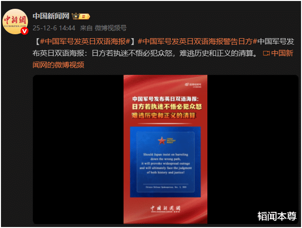 其一:昨天,中国军号发英日双语海报警告日方:日方若执迷不悟必犯众怒,难逃历史和正义的清算。
