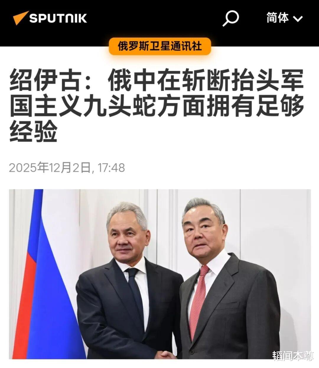 在2025年12月2日中俄第二十轮战略安全磋商中,俄罗斯联邦安全会议秘书绍伊古更是以希腊神话中的九头蛇比喻日本军国主义的复活倾向,并强调中俄两国在历史上曾共同战胜军国主义,具备“斩断其头颅”的经验与能力。