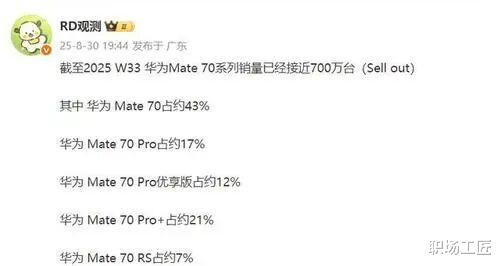 据“RD观测”提供的数据显示,截至2025年W33周,华为Mate 70系列的总销量已经超过了700万台,这个数字还没有包括W34周的数据。具体来看,华为Mate 70标准版销量最高,约占34%,即301万台;其次是华为Mate 70 Pro+,占21%,约为147万台;华为Mate 70 Pro和Pro优享版分别占据了17%和12%,销量分别为119万和84万台;华为Mate 70 RS则占据了剩余的7%,即49万台。