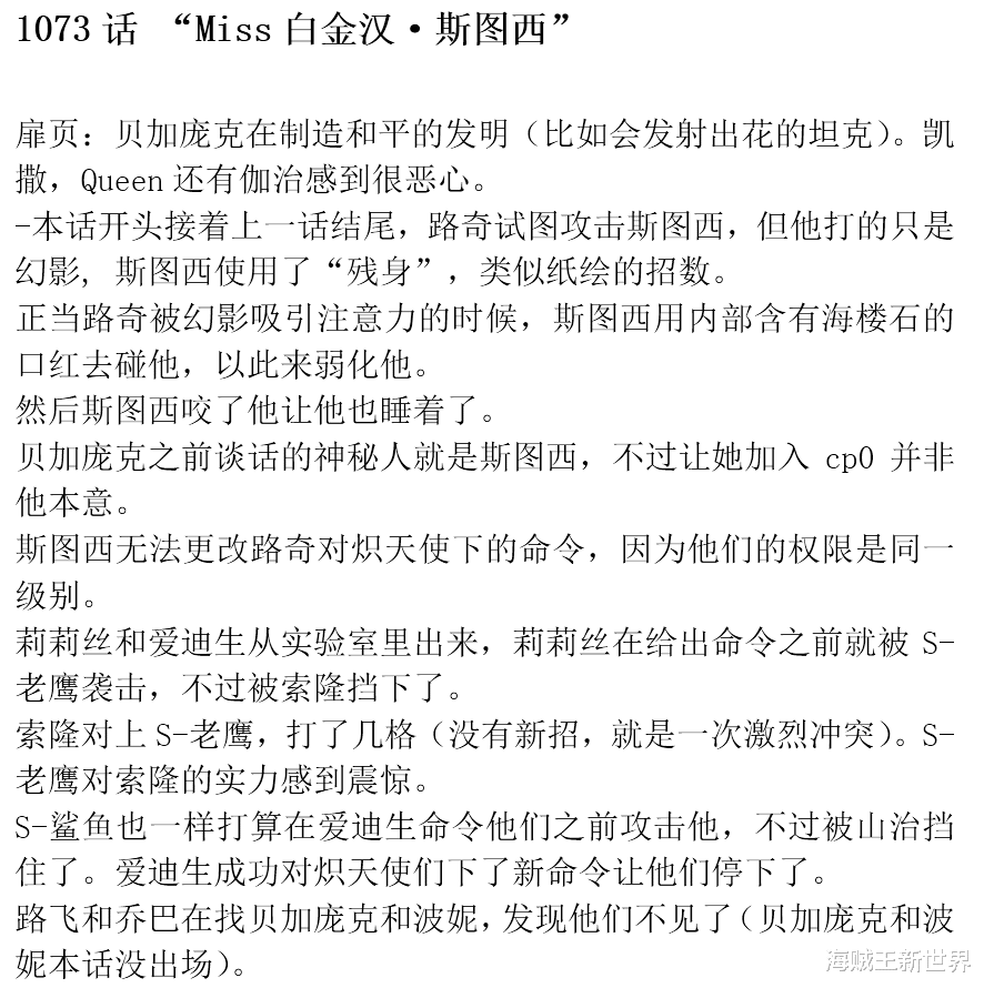 文字情报,剧透慎点!点评:之前出现的神秘人就是西图斯能够潜伏CP0身边足以显示其能力而且连续按下两位觉醒同行路奇醒来不得