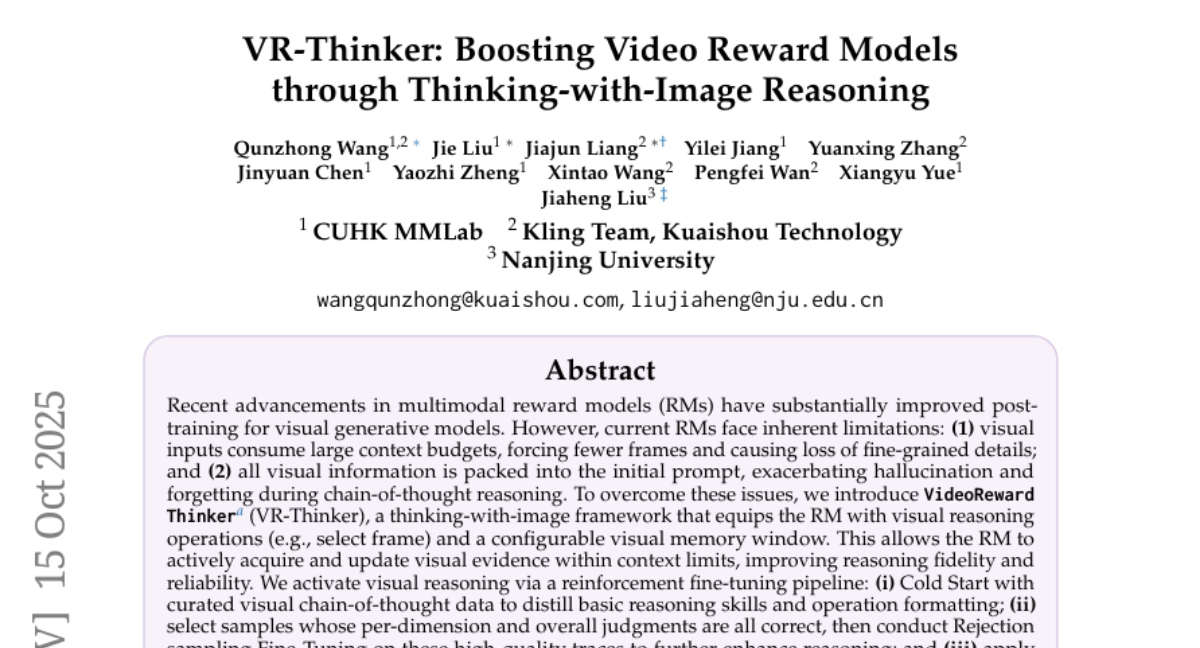 这项由中国科学院大学多媒体实验室、快手科技Kling团队以及南京大学共同完成的突破性研究,于2025年1月发表在计算机视觉领域的权威期刊上。研究团队的核心成员包括王群忠、刘杰、梁佳俊、蒋艺磊等多位来自不同机构的顶尖研究者。这项名为"VR-Thinker"的技术成果,标志着AI视频质量评估进入了一个全新的"思维时代"。感兴趣的读者可以通过论文编号arXiv:2510.10518v3查询完整研究详情。