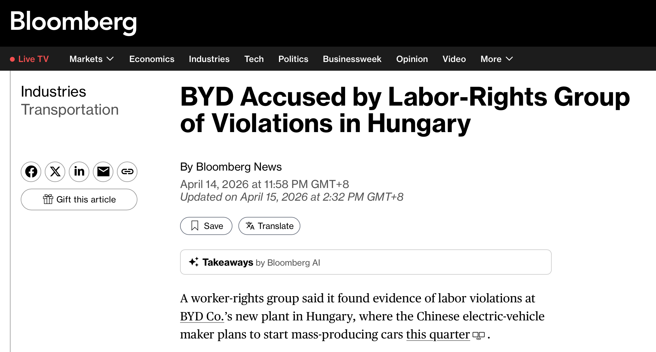 近日,彭博社发布名为《比亚迪被劳工权利组织指控在匈牙利违规》的文章,曝光了比亚迪匈牙利塞格德乘用车工厂存在签证违规使用、长时间高强度工作、扣留工资等问题,涉嫌违反劳动法规。