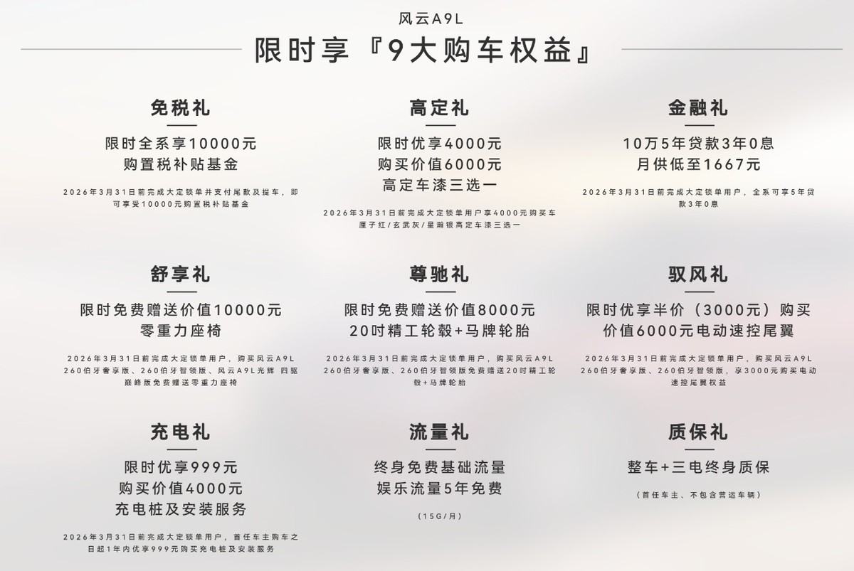 现在购买风云A9L即可限时享『9大购车权益』,其中包括限时全系享10000元购置税补贴基金;10万5年贷款3年0息月供低至1667元;限时免费赠送价值10000元零重力座椅;终身免费基础流量;整车+三电终身质保等等,限时购置税补贴价仅13.99万元即可入手,还在持币待购的朋友,可以去看看这款“全球真C级旗舰”。
