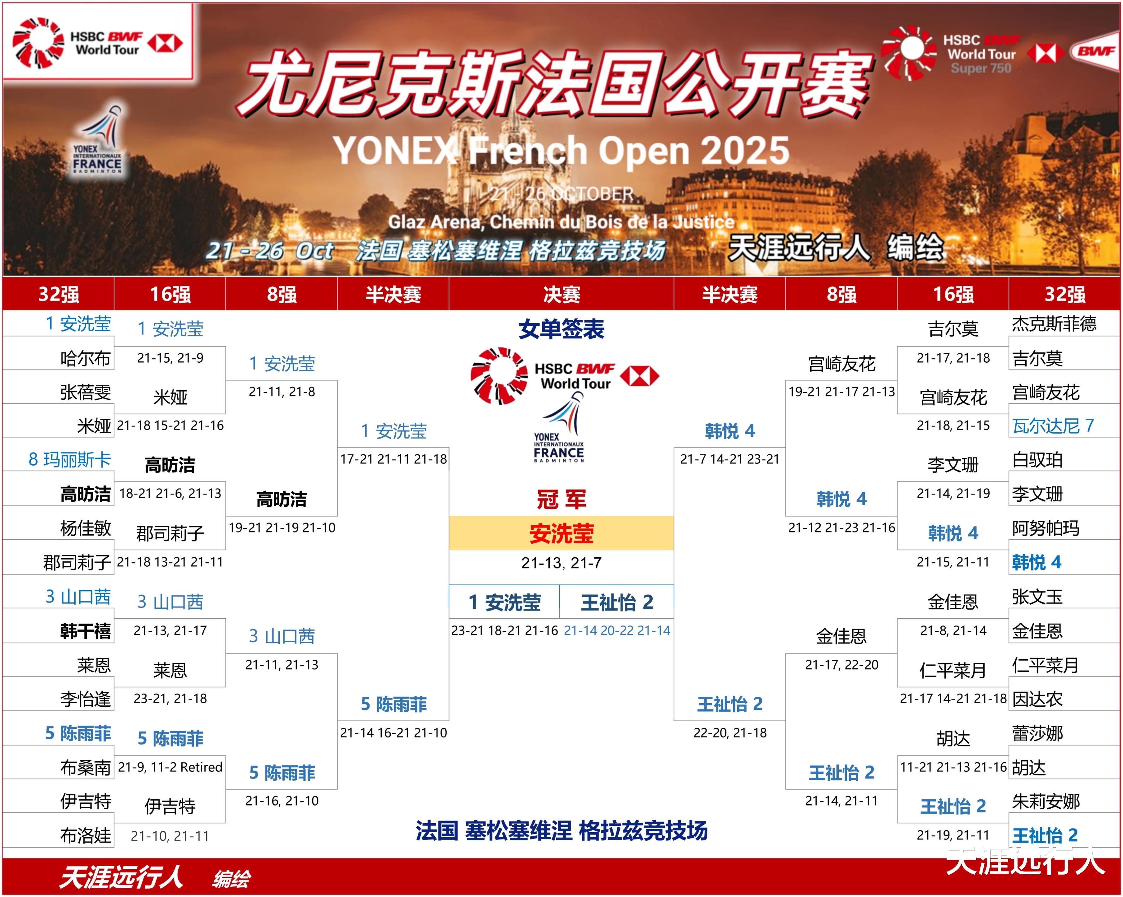 世界排名第二的王祉怡,以13-21, 7-21,连丢两局,遭世一姐安洗莹横扫,连续两站背靠背完败,摘银,安洗莹取得双方交手的七连胜,卫冕女单冠军,继2019年首次登顶之后,第三次夺得法国公开赛女单冠军,收获本赛季第9冠,这也是安洗莹职业生涯的第32个世界羽联超级巡回赛的女单冠军。
