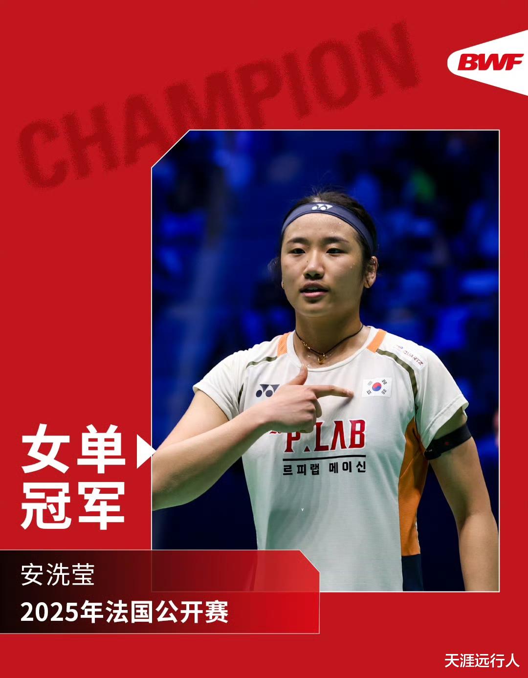 韩国安洗莹女单登顶,韩国金元浩/徐承宰男双战胜印尼组合夺冠,韩国力夺两金,成赛会最大赢家;日本福岛由纪/松本麻佑女双折桂,男单丹麦安东森横扫法国小波波夫夺魁。
