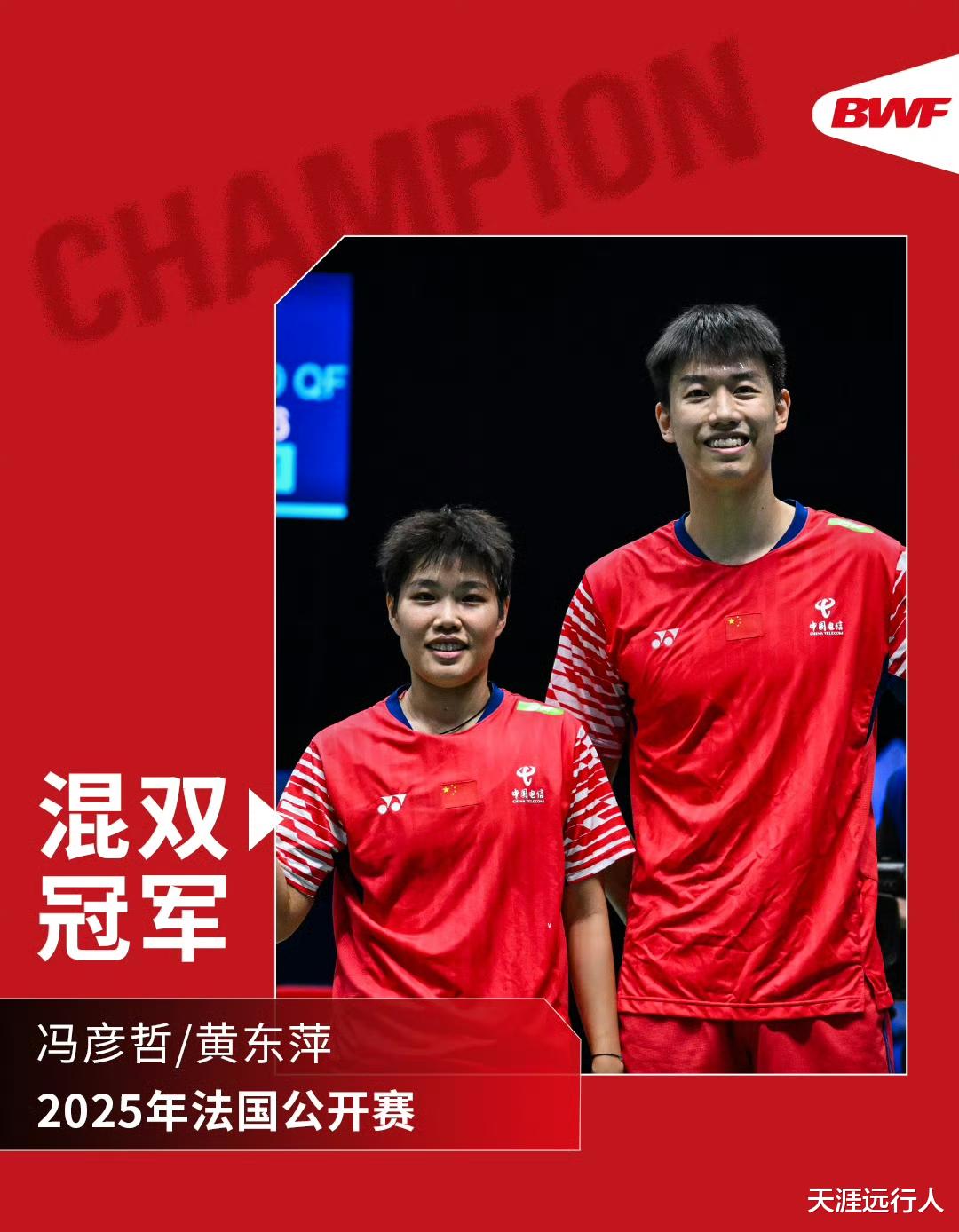 国羽世界排名第二的赛会二号种子冯彦哲/黄东萍,以27-25, 21-12,力胜泰国组合德差波/苏皮萨拉,达成交手两连胜,把双方历史交手记录改写成3-2,成功卫冕法国公开赛混双冠军,揽得本赛季超级巡回赛的第7冠,这也是两人职业生涯合作以来的第19个世界羽联超级巡回赛冠军。