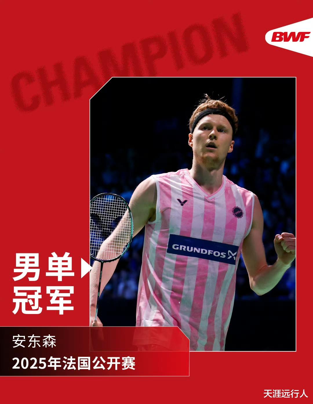 丹麦二哥安东森,以21-12, 21-19,直落两局,力胜法国小波波夫,为2025新加坡公开赛的失利复仇,夺得本赛季超级巡回赛的第二冠,也是其职业生涯的第十项世界羽联超级巡回赛的男单冠军,丹麦男单时隔三年再夺法国公开赛男单冠军,上一个法国公开赛男单冠军是2022年安赛龙获得。