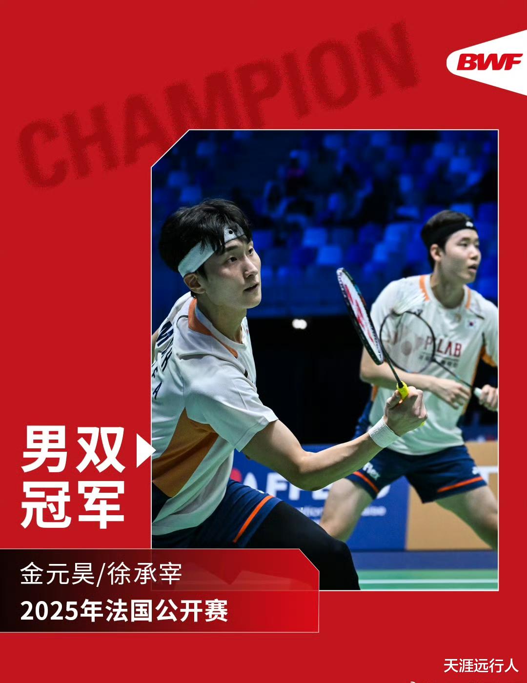 世界排名断层第一的韩国金元浩/徐承宰,以10-21, 21-13, 21-12,强势逆转拿下印尼组合阿尔菲安/菲克里,取得双方交手的三连胜,获得本赛季的第九冠,也是两人职业生涯合作以来的第八个世界羽联超级巡回赛男双冠军,韩国队时隔四年再次擎起法国公开赛男双冠军奖杯,上一次是高成炫/申白喆于2021年获得法公赛冠军。