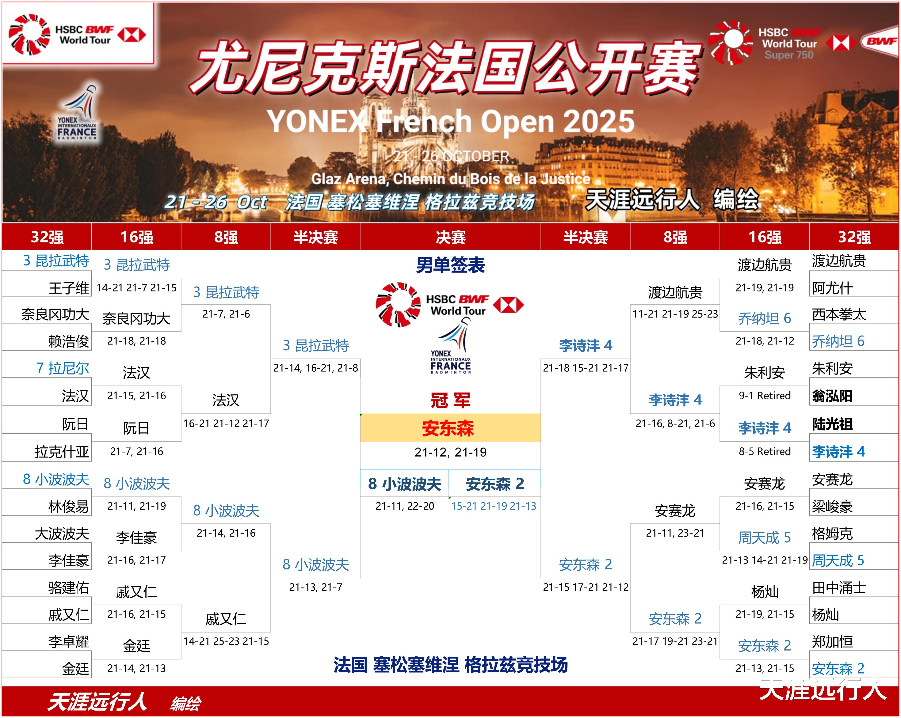北京时间10月27日凌晨0时35分,2025世界羽联超级750法国公开赛收官日的五项决赛,全部决出了胜负,五项冠军各归其主。