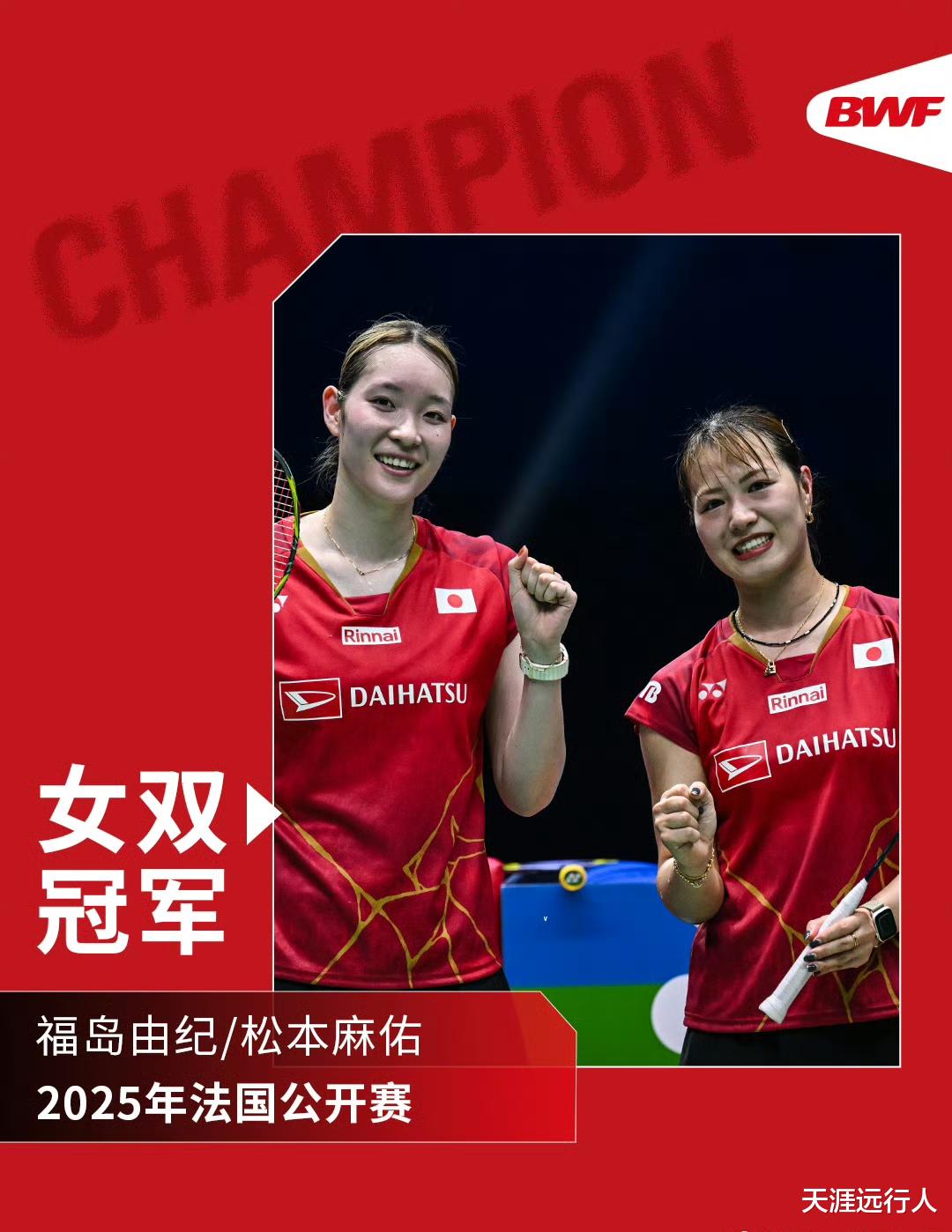 国羽李怡婧/罗徐敏,以21-17, 18-21, 15-21遭日本福岛由纪/松本麻佑逆转,遗憾摘得亚军,福岛由纪/松本麻佑为2025印尼公开赛的失利复仇,夺得本赛季的第二冠,也是两人职业生涯合作以来,继2025年初的马来西亚公开赛之后的第二项世界羽联巡回赛冠军,打破时隔10个月的冠军荒,日本队时隔7年再次捧得法国公开赛女双冠军,上一次冠军是也是松本麻佑,不过搭档是永原和可那,两人于2018年斩获冠军。