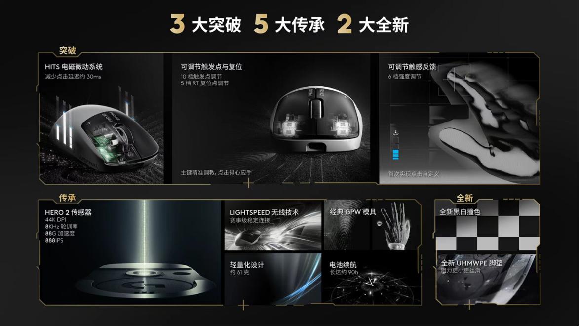 创新的HITS触觉感应触发系统可以说是这款罗技无线鼠标的最大亮点,操控鼠标时的响应延迟低至0.125ms,也就是说每0.125毫秒能完成一次数据传输,直接将点击延迟最多降低约30ms,点击响应超快,让玩家尽享业界最快的点击体验。不仅如此,玩家还可以根据自身的游戏需求,在双主键上单独微调10档触发点和5档RT复位点,自由组合打造专属操作,同时还能通过G HUB软件设置6档点击触觉反馈强度进行配合,让游戏点击手感更佳。