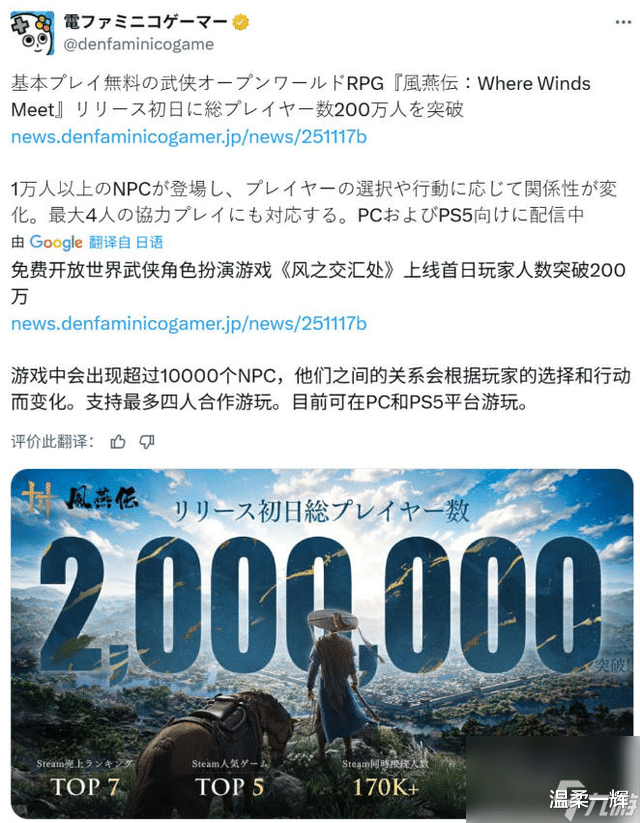 在《逆水寒》手游持续领跑海外市场的同时,网易另一款旗舰作品《燕云十六声》的出海表现同样惊艳,上线40分钟海外玩家即突破50万,24小时玩家数超200万,Steam全球最高同时在线人数超25万,横扫20个欧美地区Steam畅销榜前十!