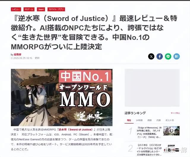 截至目前仍旧在欧美主流市场的角色扮演类游戏榜单中稳居前列,日本《朝日新闻》等多家海外媒体盛赞《逆水寒》手游为“中国第一MMO游戏”。