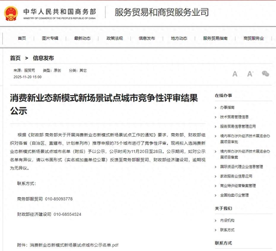 根据《财政部 商务部关于开展消费新业态新模式新场景试点工作的通知》要求,商务部、财政部组织对各省(自治区、直辖市、计划单列市)推荐申报的75个城市进行了竞争性评审。