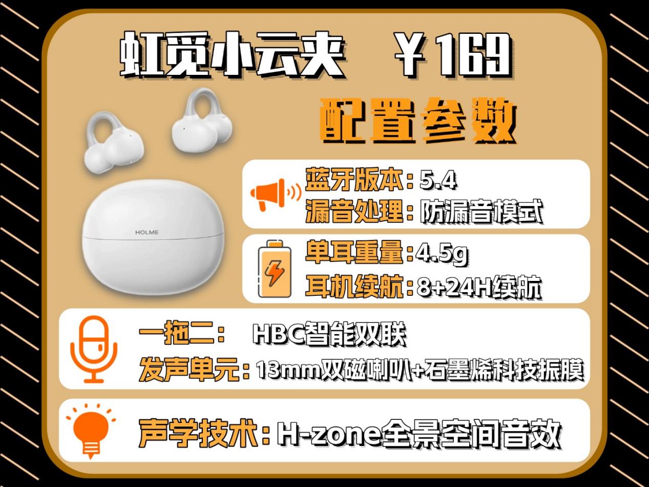 虹觅是百元档开放式耳机里的高性价比代表,专注轻量化、不漏音、好音质的实用路线。虹觅小云夹定价仅 169 元,却搭载13mm 石墨烯科技振膜,同价位硬件拉满;蓝牙 5.4 连接稳定,低延迟不卡顿;续航8+24 小时,IPX5 防水可应对日常出汗、泼溅。最亮眼的是,它还搭载专属防漏音模式,图书馆、教室、办公室都能安静使用,是同价位少见的静音场景全能选手,学生党、通勤党闭眼可冲。