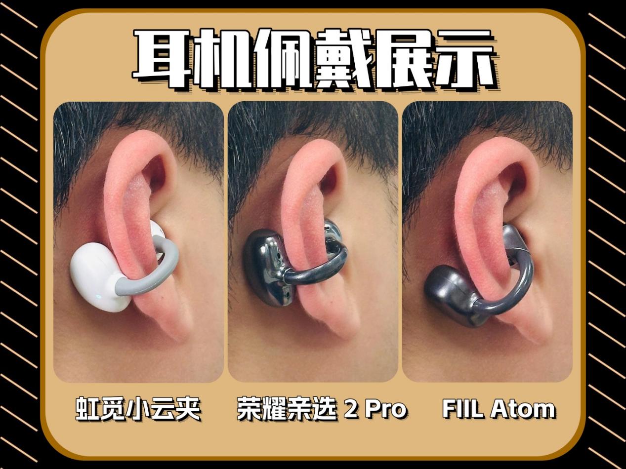 如今,开放式耳夹耳机凭借“舒适不塞耳”“安全聆听环境音”的优势,已成为学生党、上班族与通勤党的日常首选。100–400元价位的产品选择最丰富、性价比竞争也最激烈,不少人容易挑花眼。今天,我带来三款热门机型的真实横评——169元的虹觅小云夹、199元的FIIL Atom,以及399元的荣耀亲选LCHSE2 Pro,将从参数、外观、音质、佩戴体验、续航能力与防漏音效果等全维度展开对比,帮你直接选对产品、避开雷区。
