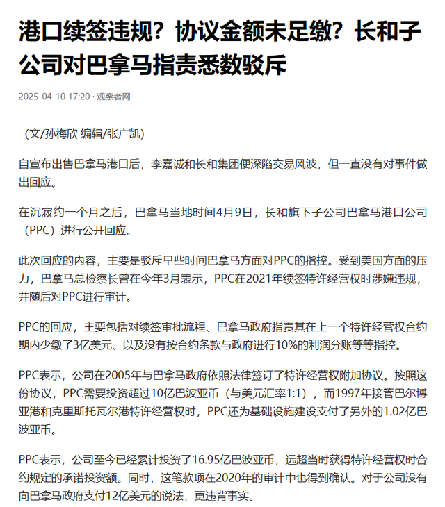 港口续签违规?协议金额未足缴?长和子公司对巴拿马指责悉数驳斥.观察者网.2025-04-10