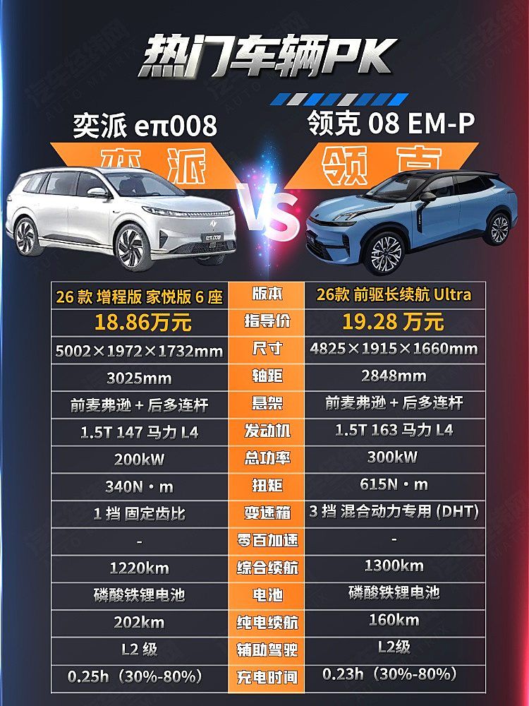 领克08 EM-P 2026款160 长续航Ultra售价为19.28万元,东风奕派eπ008 2026款六座增程家悦版售价为18.86万元售价比较接近,都面向家庭用户,而且都采用增程式电动系统,那么哪一款车更值得入手呢?